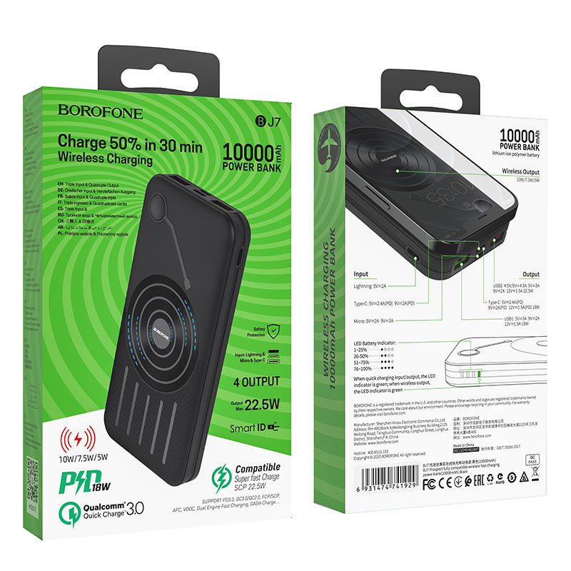 Disfruta de una carga rápida y sin cables con el power bank Borofone BJ7 Prospect. Con una capacidad de 10000mAh, es compatible con una amplia variedad de dispositivos. Olvídate de los cables y carga de forma inalámbrica tus di...